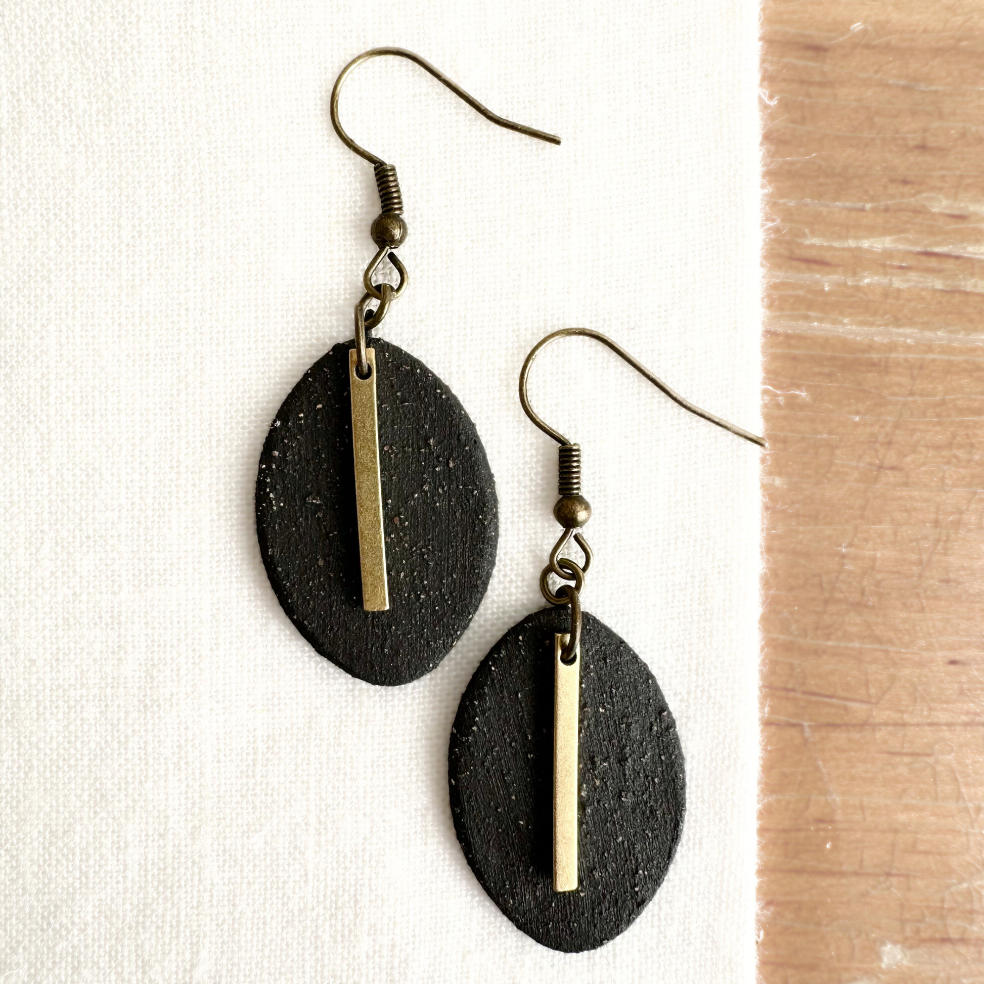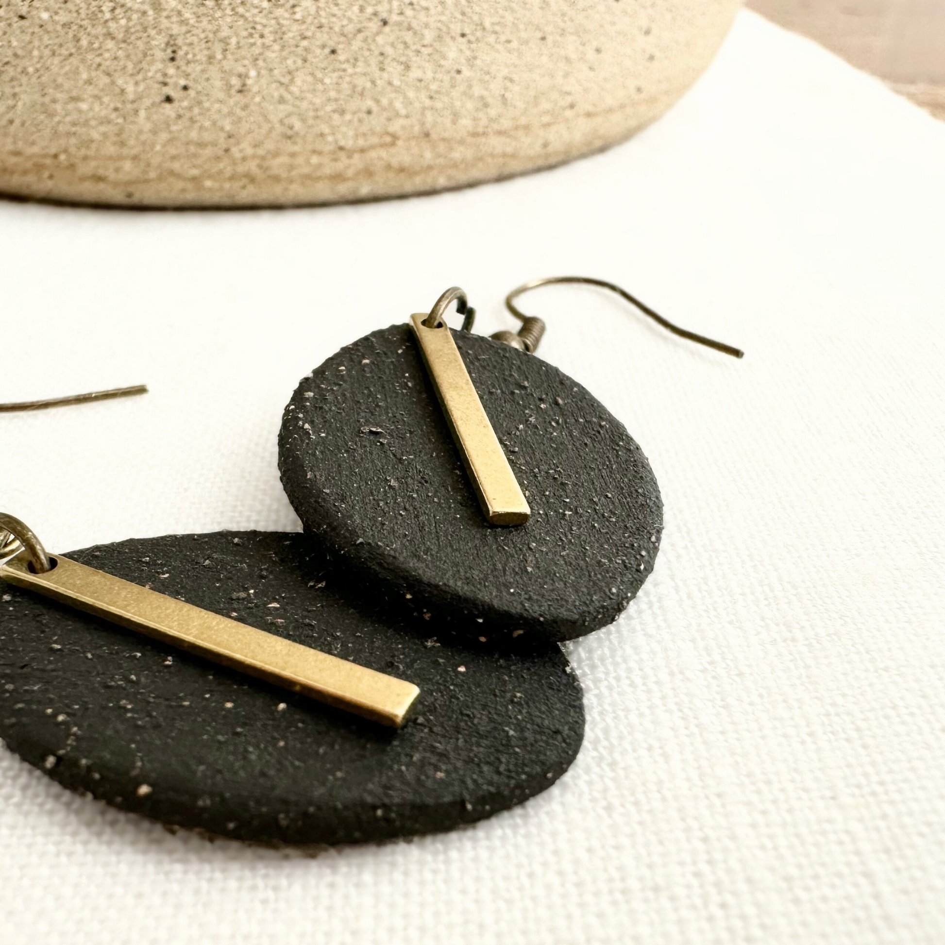 Oval, black and textured fired ceramic earrings by Mugs & Bugs. These unique, hand-made earrings are the perfect complement to any outfit, the minimalist design allowing for versatility and creativity in your personal style. The un-glazed look allows the natural texture and beauty of the original clay body to shine through in this piece, and their lightweight composition, as well as hypoallergenic metal hardware ensure comfort. No two pairs are exactly the same as each of our earrings are made by hand, so slight variations in size and shape may occur (and make them that much more special). We hope you enjoy wearing these as much as we enjoy hand-making them! Dimensions: Ceramic- 1.25" x 1.25" Hardware- 1"