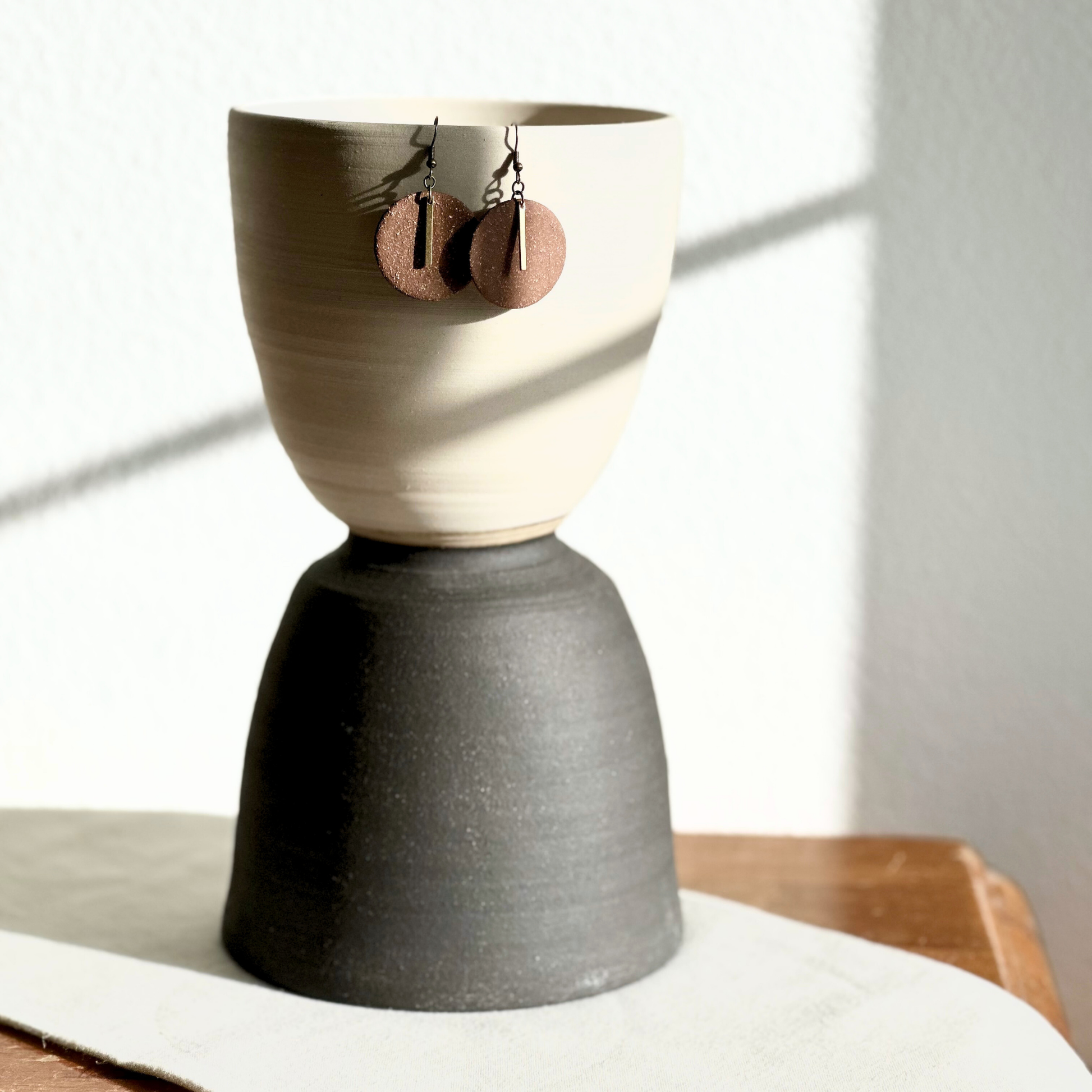 Round, chestnut brown and textured fired ceramic earrings by Mugs & Bugs. These unique, hand-made earrings are the perfect complement to any outfit, the minimalist design allowing for versatility and creativity in your personal style. The un-glazed look allows the natural texture and beauty of the original clay body to shine through in this piece, and their lightweight composition, as well as hypoallergenic metal hardware ensure comfort. No two pairs are exactly the same as each of our earrings are made by hand, so slight variations in size and shape may occur (and make them that much more special). We hope you enjoy wearing these as much as we enjoy hand-making them!