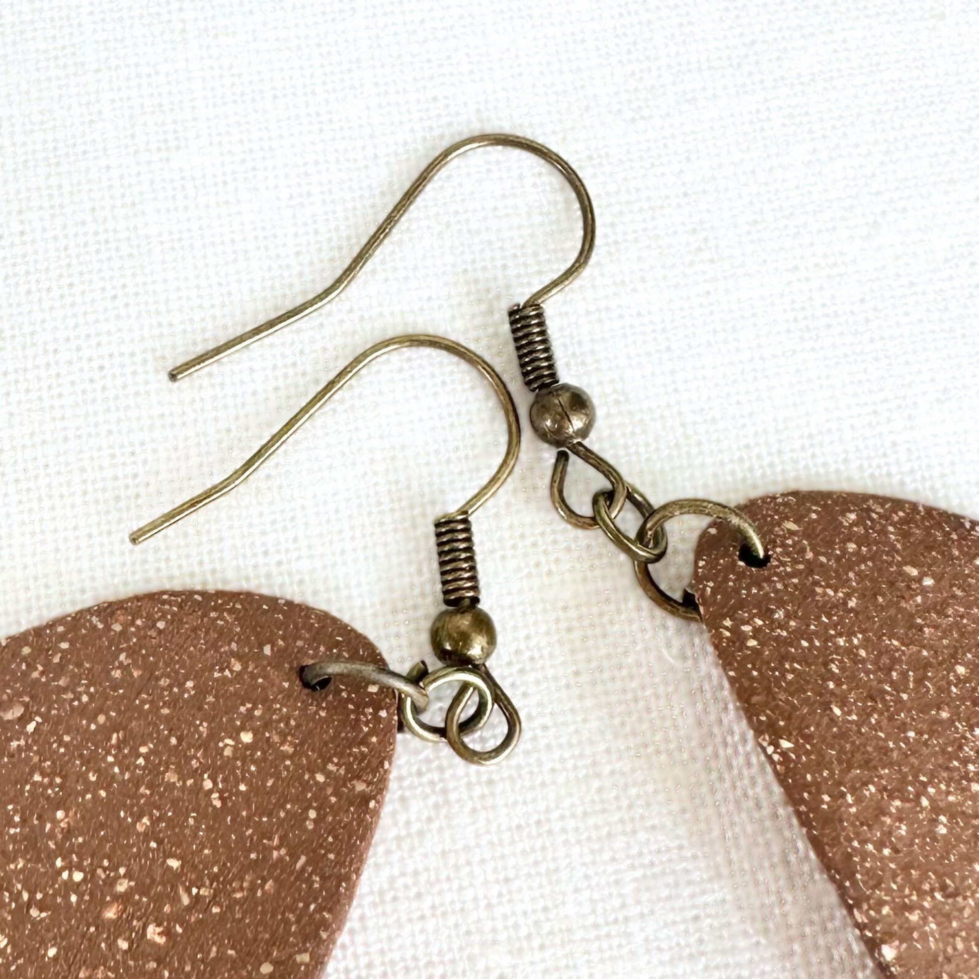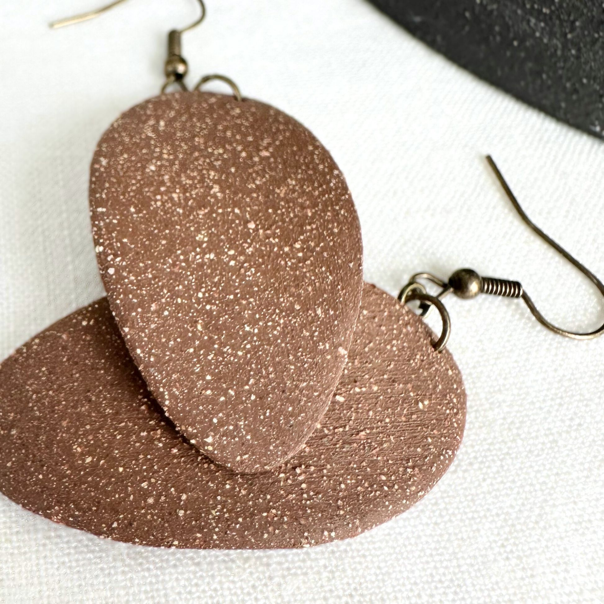 Oblong chestnut brown and textured fired ceramic earrings by Mugs & Bugs. These unique, hand-made earrings are the perfect complement to any outfit, the minimalist design allowing for versatility and creativity in your personal style. The un-glazed look allows the natural texture and beauty of the original clay body to shine through in this piece, and their lightweight composition, as well as hypoallergenic metal hardware ensure comfort. No two pairs are exactly the same as each of our earrings are made by hand, so slight variations in size and shape may occur (and make them that much more special). We hope you enjoy wearing these as much as we enjoy hand-making them!