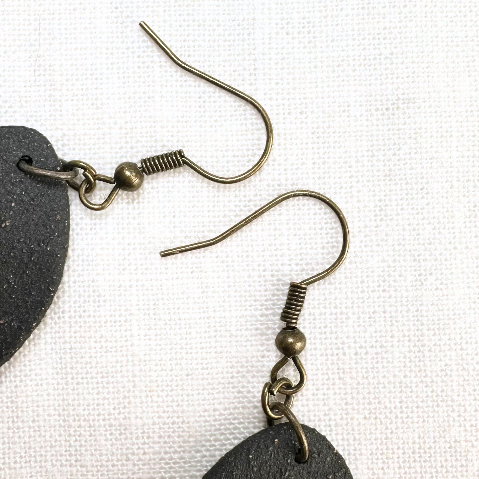 Oval, black and textured fired ceramic earrings by Mugs & Bugs. These unique, hand-made earrings are the perfect complement to any outfit, the minimalist design allowing for versatility and creativity in your personal style. The un-glazed look allows the natural texture and beauty of the original clay body to shine through in this piece, and their lightweight composition, as well as hypoallergenic metal hardware ensure comfort. No two pairs are exactly the same as each of our earrings are made by hand, so slight variations in size and shape may occur (and make them that much more special). We hope you enjoy wearing these as much as we enjoy hand-making them!